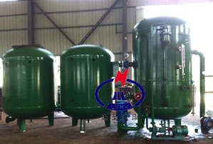 四、三位一體真空電化學除氧器設備組成 三位一體真空電化學除氧器主要是由除氧器(除氧頭)、高效旋膜裝置、連續反應電解缸、增壓泵、真空泵機組、引水泵機組、PLC控制箱等部件組成。 三位一體真空電化學除氧器配有電解器,內裝設有高效旋膜裝置, 將自然降膜改為強力旋膜,增加液膜的更新度,并造成液膜沿管壁強力旋轉,增強分散、傳質功能;將相應泡沸改為懸掛式泡沸。克服層中水汽流速高時泛點(飛濺),并將保持汽(氣)體通道;將獨立的三種傳熱傳質方式縮化為一體,在一個單元的部件內完成。由于它具有很高的效率和某些特殊功能,突破了其它除氧器的技術性能。 三位一體真空電化學除氧器運行時,除氧器處于負壓狀態。在高位安裝時,電解罐出口與鍋爐給水泵進口的距離應較大,不小于10米;低位安裝時,電解罐出口與引水泵機組相聯接,使負壓水升壓后進入鍋爐給水泵。真空泵機組中配用了特種真空泵,具有設計結構緊湊,耗功極低。并具有很高的抽吸效率,在同等條件下抽氣量比其它真空泵高一倍。噪聲低,無振動,安裝布置更簡單。引水泵機組的作用是在除氧器低位安裝時,通過引水泵將負壓水升壓后接入鍋爐給水泵。 三位一體真空電化學除氧器投運,第一步把除氧器的冷卻水箱的水位補到溢流口,溢流口閥門為開式,冷卻水箱的補水口也是正常補水,保證冷卻水箱水溫在30℃,關閉相關閥門,先把除氧器的水位補到運行標準水位。啟動真空泵,打開吸入管道上的閘閥,除氧器的真空度達到-0.09Mpa時,打開進水閥門,開啟鍋爐給水泵,被除氧水進入旋膜器,在0.2Mpa的水壓下形成高效率水膜裙,在高真空下運行,把水溫度提高約30℃-60℃,氧氣充分吸出被真空泵吸出排入冷卻水箱。除過氧的給水進入電解器電解除氧,再次進入電化學罐除氧,除氧水被排入三級化學罐進行化學除氧,鍋爐給水泵將除過氧的水送給鍋爐。除氧器停用時必須先關閉吸入管道上的閘閥,再停真空泵,如果先停真空泵,不關吸入管道上的閘閥,除氧器處于真空狀態,會將冷卻水箱的水倒吸至除氧器,影響除氧效果。 五、三位一體真空電化學除氧器自動控制系統 1、設備正常運行屬全自動控制,無人值守,設備全套運行由PLC智能控制,所有運行參數及控制點都由PLC自動監測、自動調整。所有閥門及真空泵組自動控制開啟(亦可手動開啟)。 2、設備在線運行真空度控制在-0.08Mpa以上。確保除鹽水進入除氧器,并在高效旋膜裝置內強力旋轉,形成水膜裙,氧氣得到充分析出。一旦真空度低于-0.08Mpa,設備自動報警,PLC控制系統自動啟動電化學除氧,此時需人員進行現場調整修復。當真空度修復PLC控制系統自動停止電化學除氧。 3、水位由液位自動控制器控制,如水位低于設計水位時設備將自動報警。PLC控制系統自動打開旁路進水閥。水位修復PLC控制系統自動關閉旁路閥。 4、PLC自動跟蹤控制電動給水調節閥及真空度,始終保持兩極真空電化學除氧器處于安全穩定運行。 六、三位一體真空電化學除氧器訂貨須知 三位一體真空電化學除氧器進行技術選型需提供如下數據: 1、兩極真空電化學除氧器的出力。 2、兩極真空電化學除氧器的安裝高度。 3、兩極真空電化學除氧器進水壓力,進水溫度。