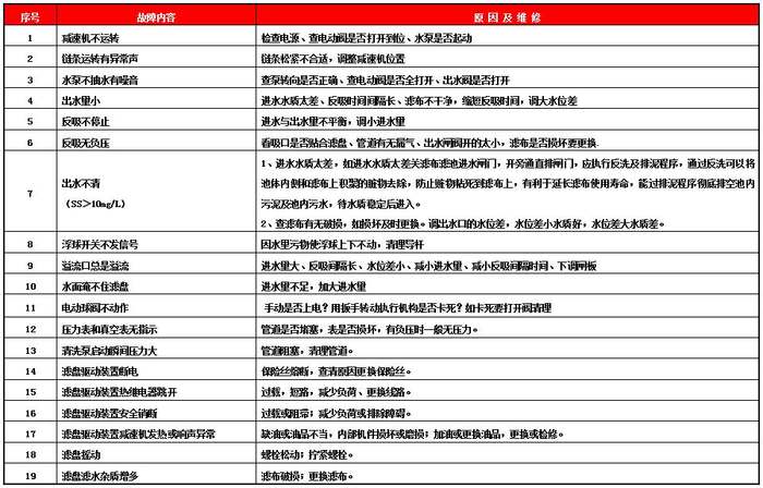 五、纖維轉盤過濾器,纖維轉盤過濾池培訓計劃 1、目的 使用戶操作和維修人員了解掌握纖維轉盤過濾器,纖維轉盤過濾池設備的工作原理、結構組成、運行操作、程序設定、故障排除、維護保養等技能。 2、內容 1)纖維轉盤過濾器,纖維轉盤過濾池的工作原理。 2)纖維轉盤過濾器,纖維轉盤過濾池的進水水質控制。 3)纖維轉盤過濾器,纖維轉盤過濾池的各部件的結構組成。 4)纖維轉盤過濾器,纖維轉盤過濾池的運行操作方法。 5)纖維轉盤過濾器,纖維轉盤過濾池的電氣原理和程序的設定。 6)纖維轉盤過濾器,纖維轉盤過濾池的常見故障和排除方法。 7)纖維轉盤過濾器,纖維轉盤過濾池的維護及保養。 六、纖維轉盤過濾器,纖維轉盤過濾池控制系統操作說明 1、手動自動方式選擇 將控制柜手動/自動旋鈕擰在“手動“位置,根據面板上的按鈕來控制啟停;將開關旋至”自動“位置,系統根據設置的程序自動運行。 2、自動控制方式 將控制柜手動/自動開關旋至“自動”位置,觸摸屏手動/自動切換按鈕也在“自動”狀態,自動準備工作就緒,程序自動完成以下功能: 反洗根據液位和時間兩種設置運行(液位先到根據液位反洗,時間先到根據時間反洗,以前者為工作條件當運行開始后后者時間重新開始計時)。另外還有高位浮球保護當液位失靈水位上升接觸到高位浮球后就開始反洗程序。 自動反洗: 排泥:啟動排泥閥,閥開到位后,1#反洗泵開始工作吸泥。當排泥時間(時間可在參數界面設置)到,排泥完成進入清洗。 注明:排泥閥排泥過程中按需要時間長短可設置。從排泥到清洗過程中轉換閥門時污泥泵不停止。反洗閥清洗時間都可在文本上設置。液位的量程和高低液位也可在屏幕上設置。 七、纖維轉盤過濾器,纖維轉盤過濾池注意事項 1、用戶在使用前應仔細閱讀說明書,嚴格按說明書要求使用水泵。 2、每個抽吸水泵在啟動的時候保證所對應的閥門中有一個處于完全打開狀態才能啟動。 3、觸摸屏上的參數禁止隨意調整,如有調整,請加強巡視,確保調整后設備正常運行。 4、如要長時間停用設備或檢修設備,應執行反洗程序,通過反洗可以將池體內側和濾布上積聚的臟物去除,防止贓物干后粘死到濾布上,有利于延長濾布使用壽命。 八、纖維轉盤過濾器,纖維轉盤過濾池電氣部分設備維護 每3個月檢查電氣柜內的接線端子是否有松動現象,有此現象時應當緊固接線端子,當電氣部分發生故障后,應依照電氣原理圖,檢查電氣線路是否正常,空開是否有跳閘現象,保險有無燒斷,找到原因并解決問題后方能重新上電。 減速機,泵電機每個3個月加一次潤滑油,電動閥執行機構定期加黃油,防止生銹。 九、纖維轉盤過濾器,纖維轉盤過濾池冬季運行注意事項 1、用戶必須在冬季來臨前對設備外圍管道、電動閥體、水泵做防凍保溫處理。 2、冬季停機時,設備外圍管道、電動閥體、水泵長時間裸露在外,管道內的水處于靜止狀態,即使在有保溫設施時也可能出現凍裂現象;針對此情況,在用戶保證正常提供進水情況時,請在在控制系統界面點擊1#系統或者2#系統手動反洗程序按鈕(運行方式與自動方式相同)確保設備正常。 3、冬季停機時,用戶不能保證正常提供進水時,應當排空濾池內水,并且將設備外圍管道、電動閥體、水泵內的水排空,防止凍裂閥門、管道、水泵。 4、用戶在室外溫度持續降低,應判斷手動反洗程序能否保證設備外圍管道不被凍裂,有被凍裂可能時,應提前排空過濾池內水,并且將設備外圍管道、電動閥體、水泵內的水排空,防止凍裂閥門、管道、水泵。